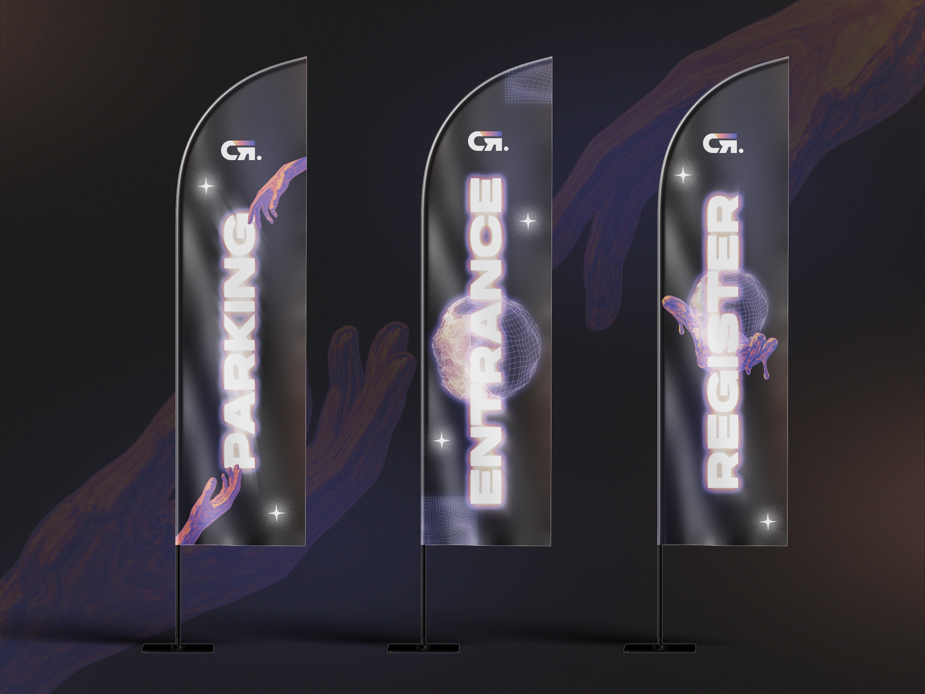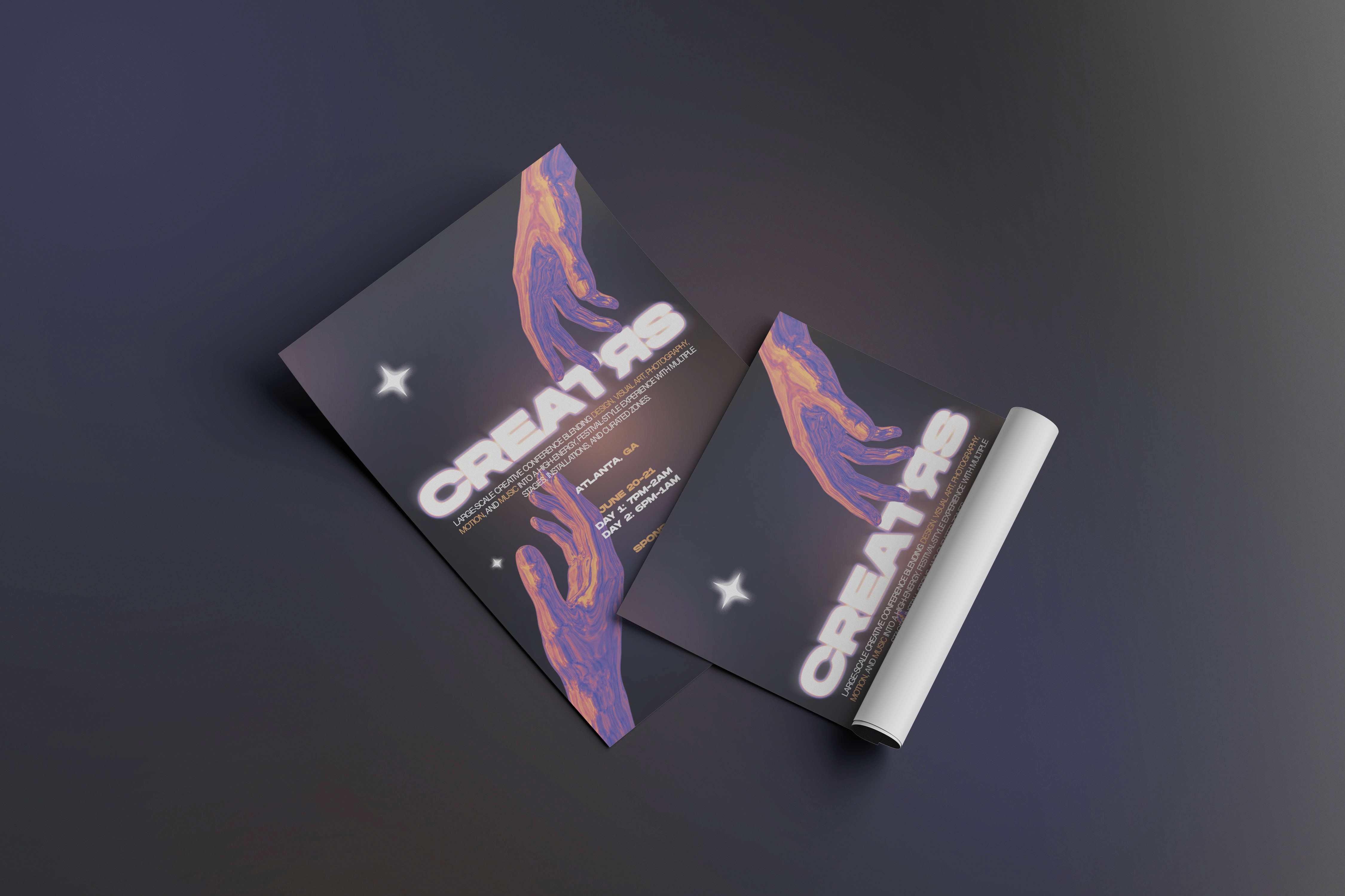 The Creatrs brand embraces a Y2K futurism aesthetic, combining glossy textures, neon color palettes, and futuristic typography to create a bold, immersive identity. Inspired by early digital culture and forward-looking design, the system captures both nostalgia and innovation, positioning the conference as a visually striking and culturally relevant space for creatives to connect and collaborate.